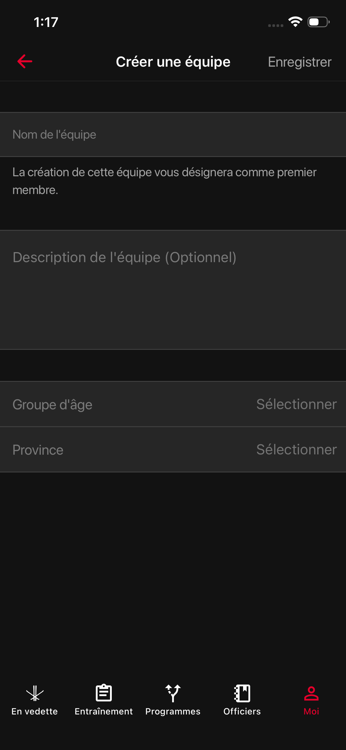 Vous serez dirigé vers la page Créer une équipe. Entrez les informations suivantes :